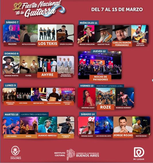 La programación de la Fiesta Nacional de la Guitarra incluye artistas premiados, referentes del folclore tradicional, el canto surero, la infaltable guitarra criolla y las improvisaciones de payadores que sacan a relucir toda su creatividad y destreza en la improvisación poética. Esta vez, la celebración contará con la participación de músicos de nueve provincias argentinas, un símbolo del enfoque federal de la fiesta, algo que la convierte en un potente motor cultural y económico de la provincia de Buenos Aires.